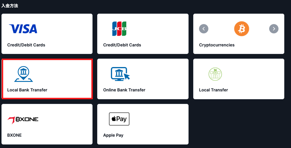 XM会員ページにログイン後、上部メニューの「資金の入金」を選択し、入金方法一覧から「Local Bank Transfer(国内銀行送金)」をクリックします。