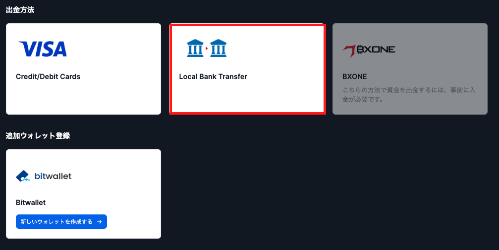 XM会員ページにログイン後、上部メニューの「資金の出金」を選択し、出金方法一覧から「Local Bank Transfer(国内銀行送金)」をクリックします。