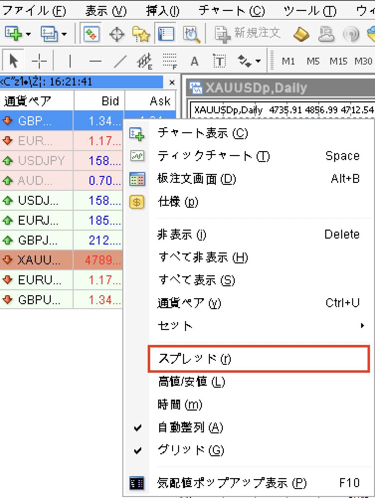 ゴールドは値動きが激しくスプレッドの変動幅も大きいため、時間帯や相場状況による変化が他の銘柄より大きい点には注意が必要です。