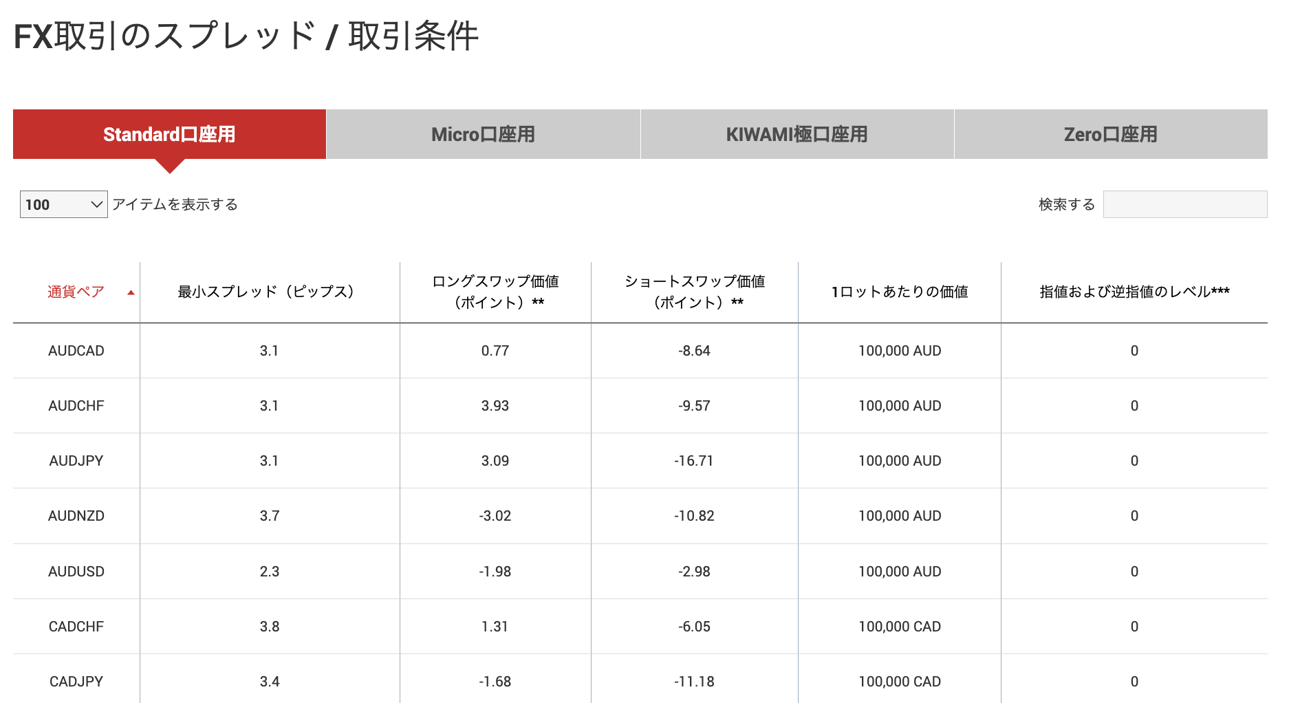 通貨ペアスタンダード口座KIWAMI極口座ゼロ口座